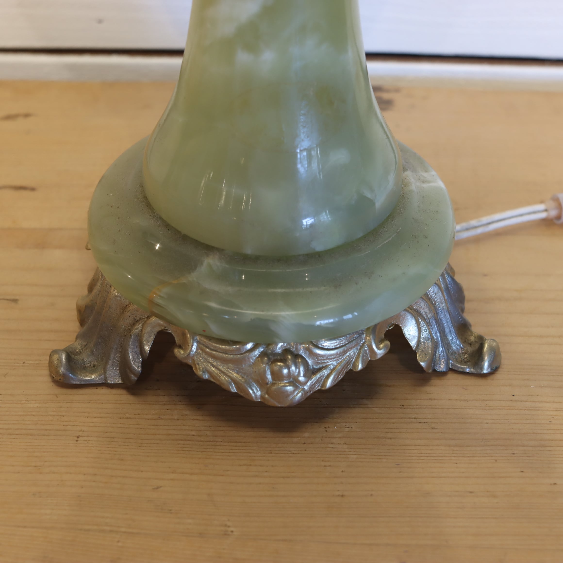 ミルクガラスのぽってりとしたシェードに細やかな真鍮の装飾が施されているとてもクラシカルなランプです。