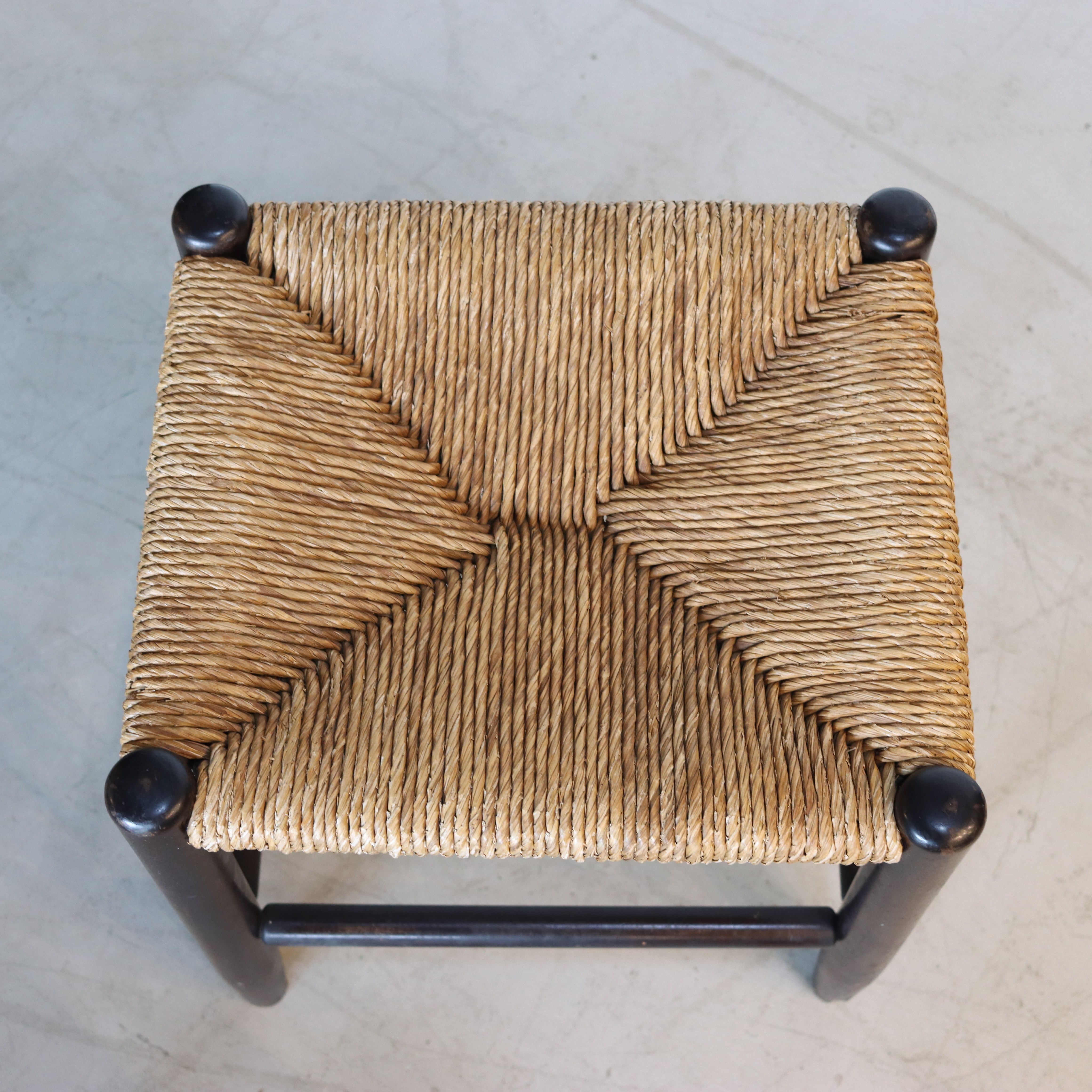 松本民芸家具としては珍しい楢材を用いたスツールで、ラッシとは藺草(フトイ)という井草の一種のこと。