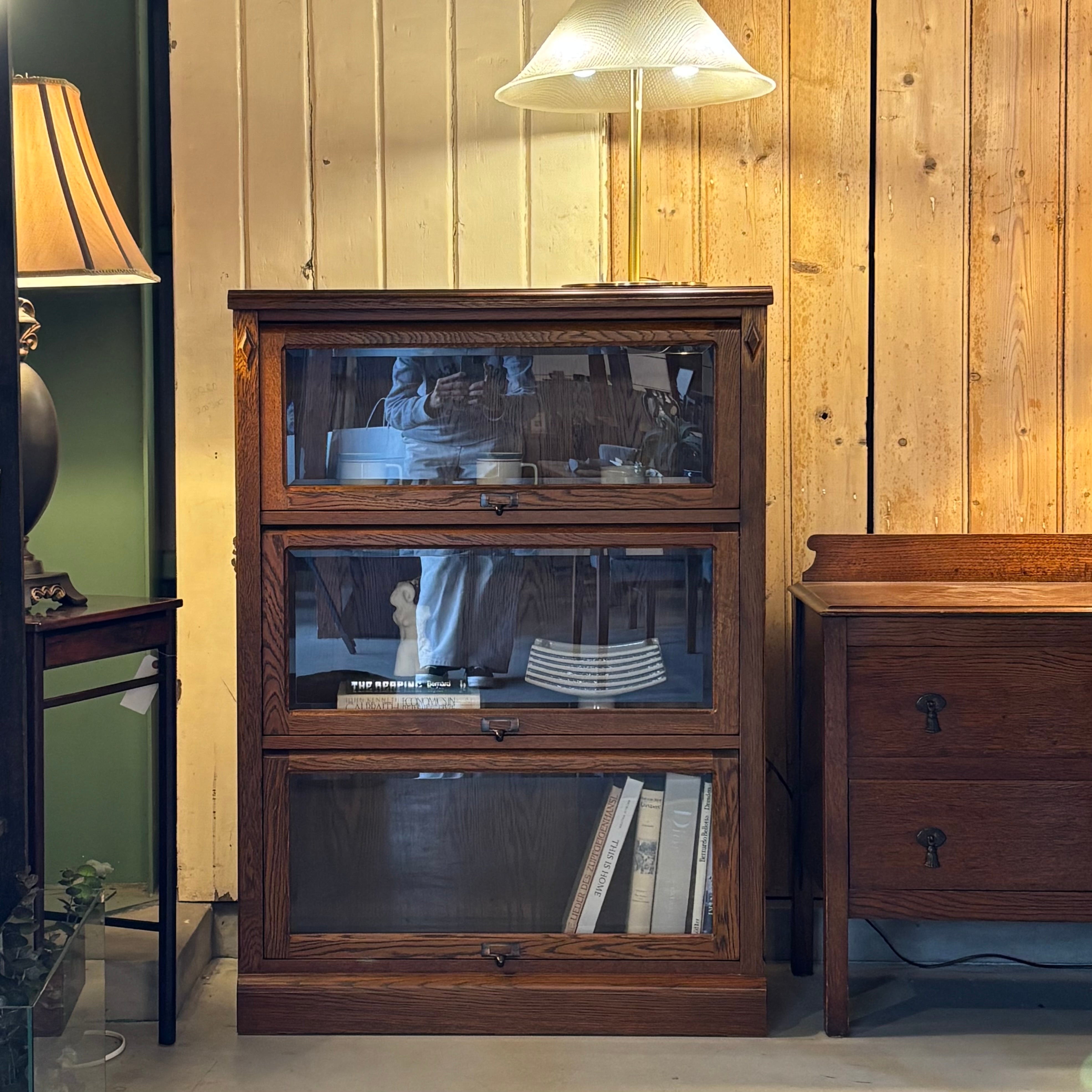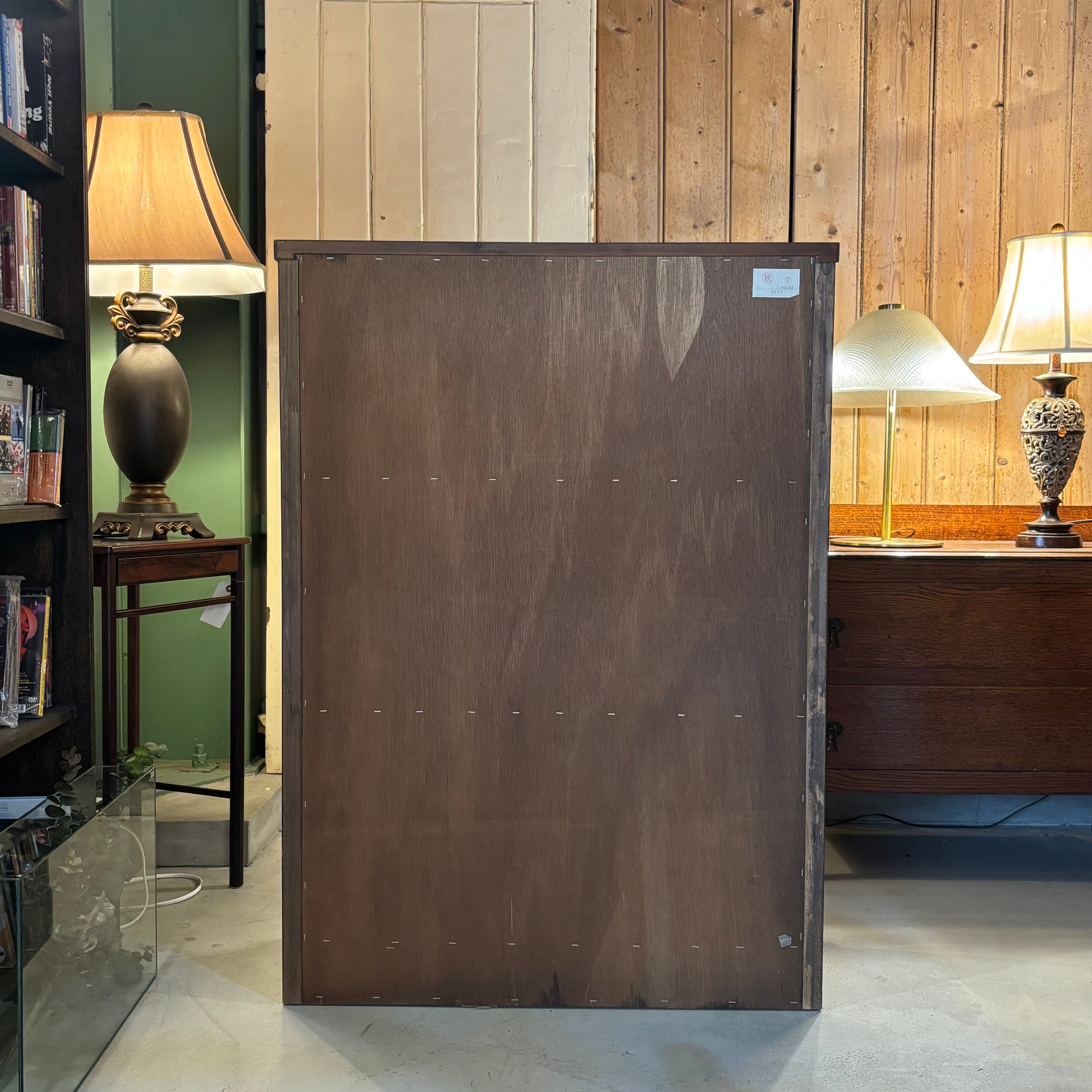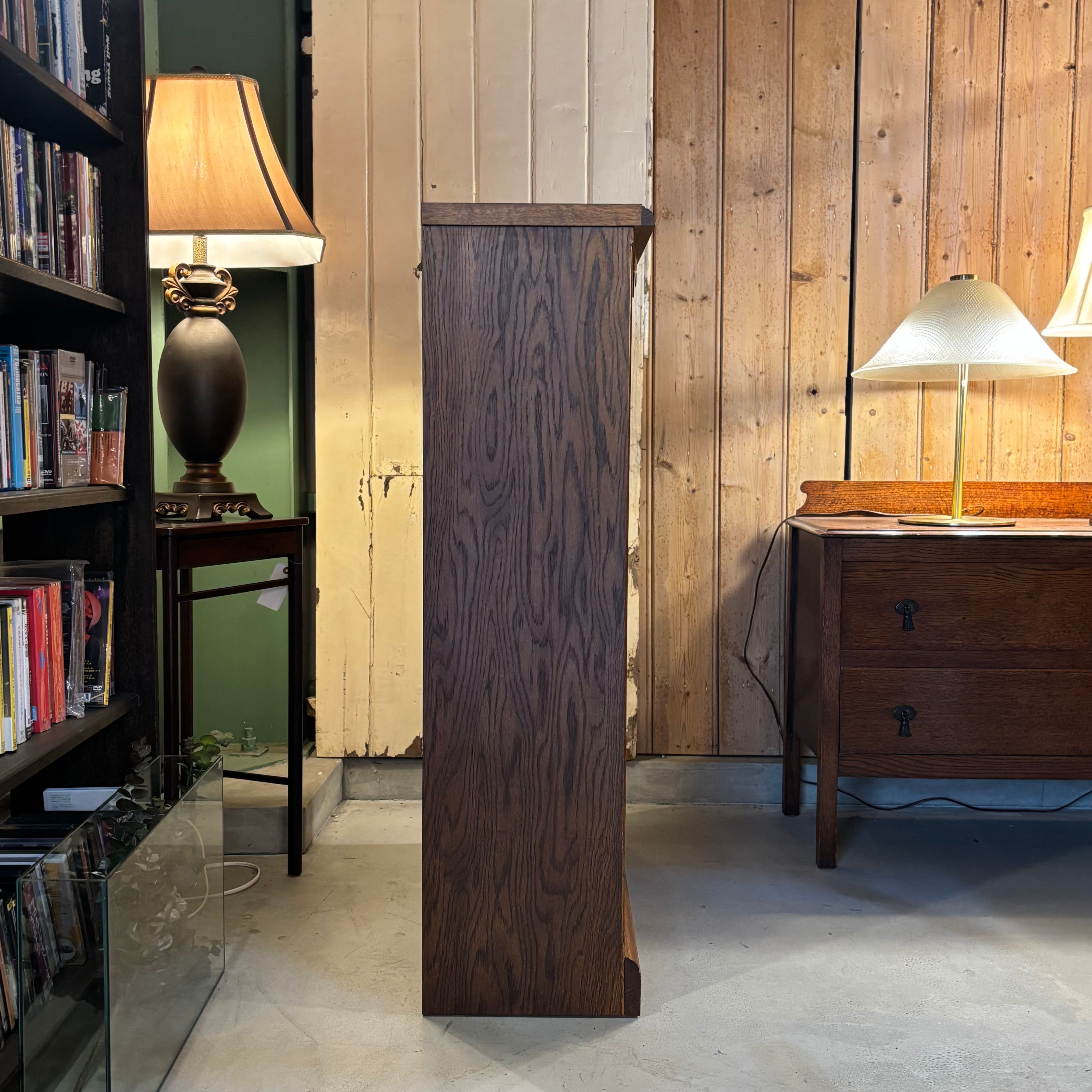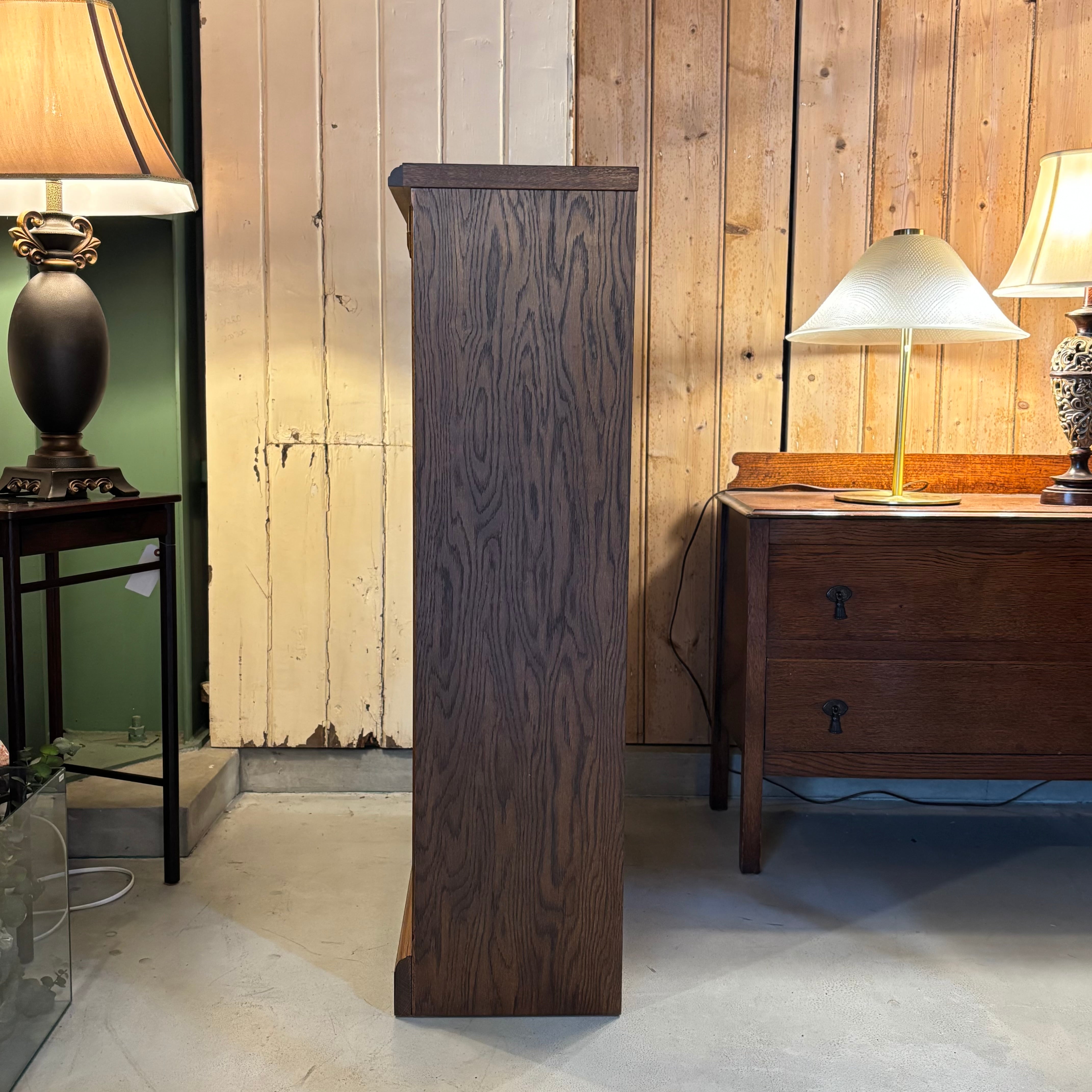 .ガラス越しに見せる収納が楽しめるキャビネット。 木目の表情がしっかり出たオーク材に、 フラップ式のガラス扉。 お気に入りの本や器、オブジェを飾って楽しんでください。 Size:W850 D330 H1180mm 新品ではございませんので、多少のコキズや使用感はご了承くださいませ。 *中古品のため写真に撮りきれない小傷等ご理解ください。神経質な方、完璧を求める方はご遠慮ください。