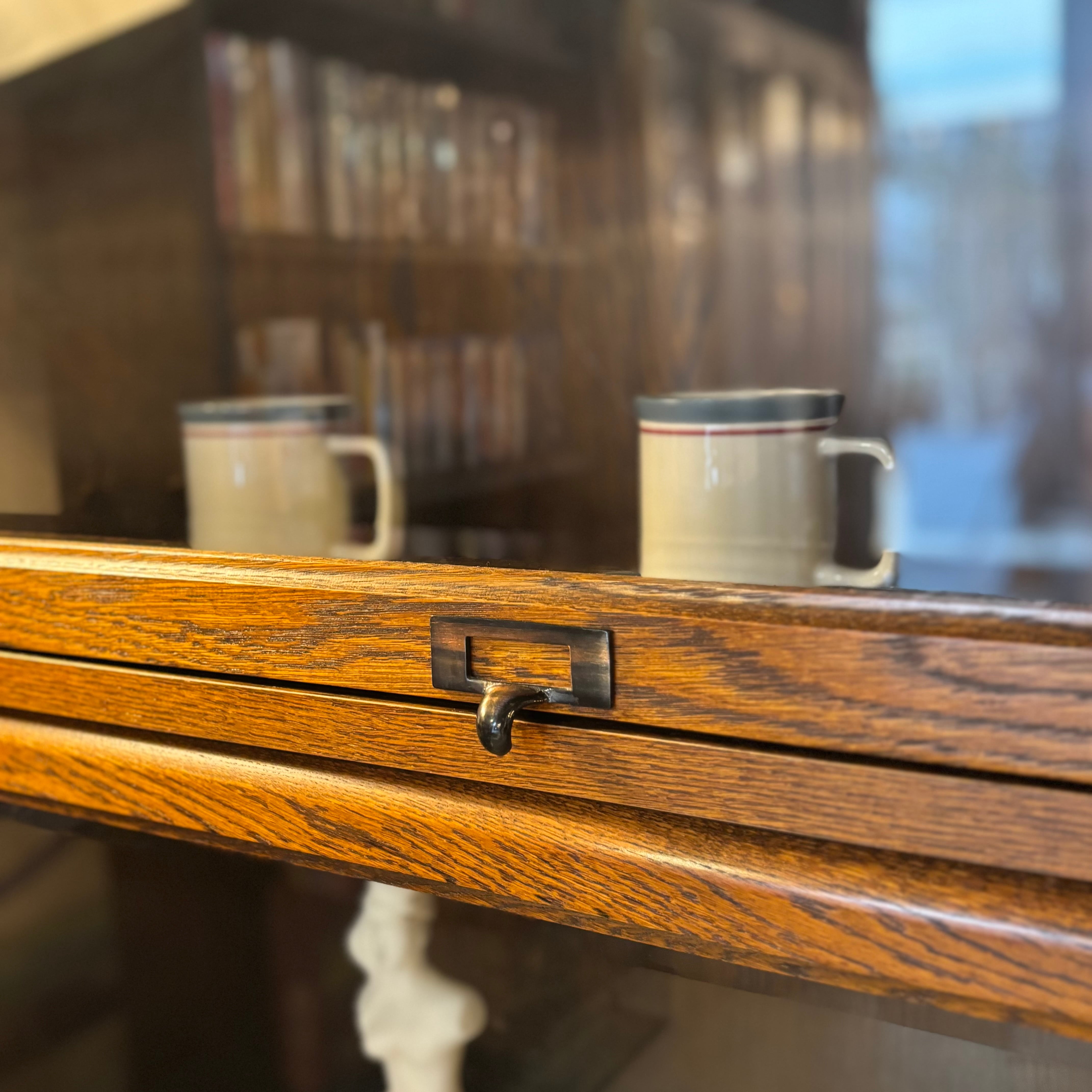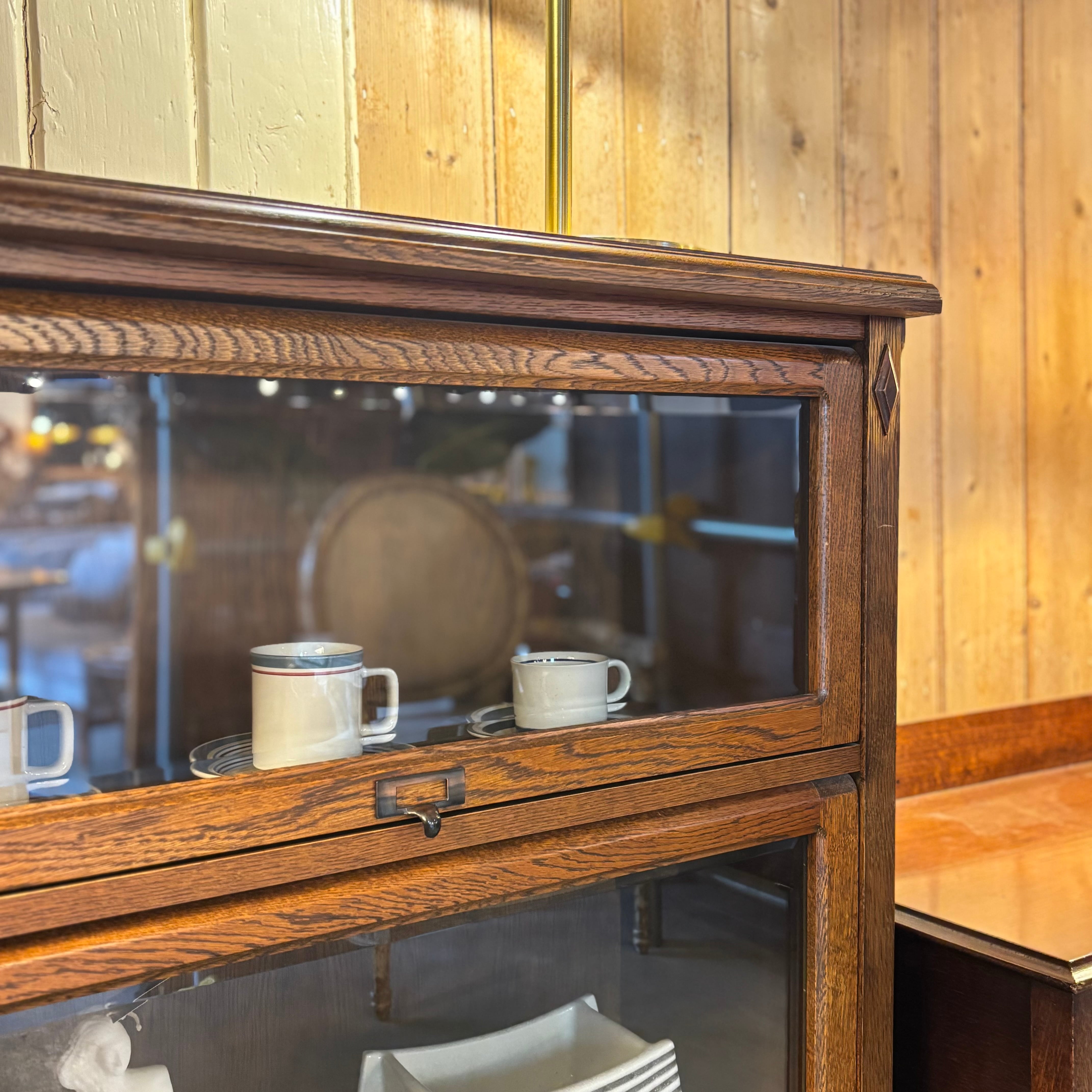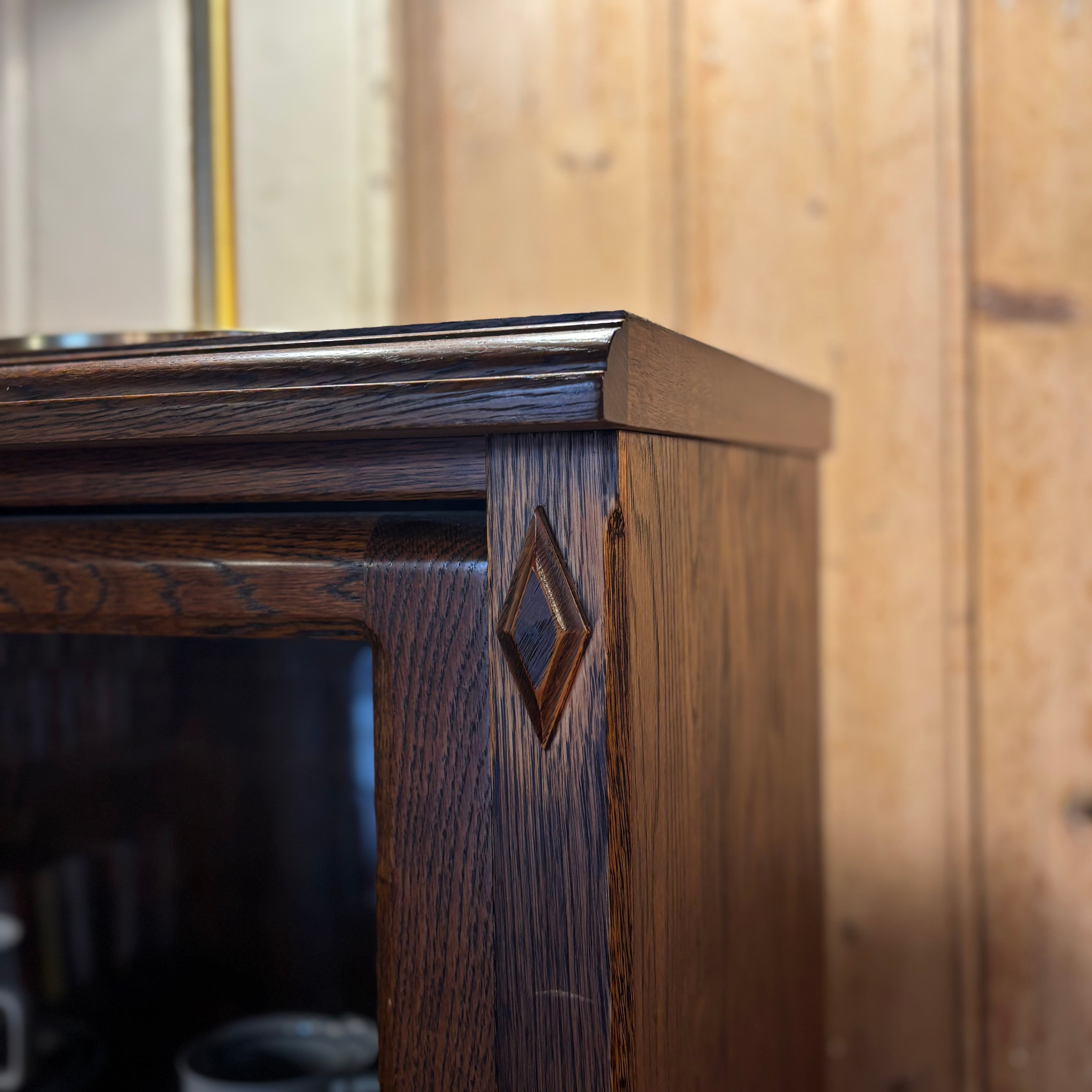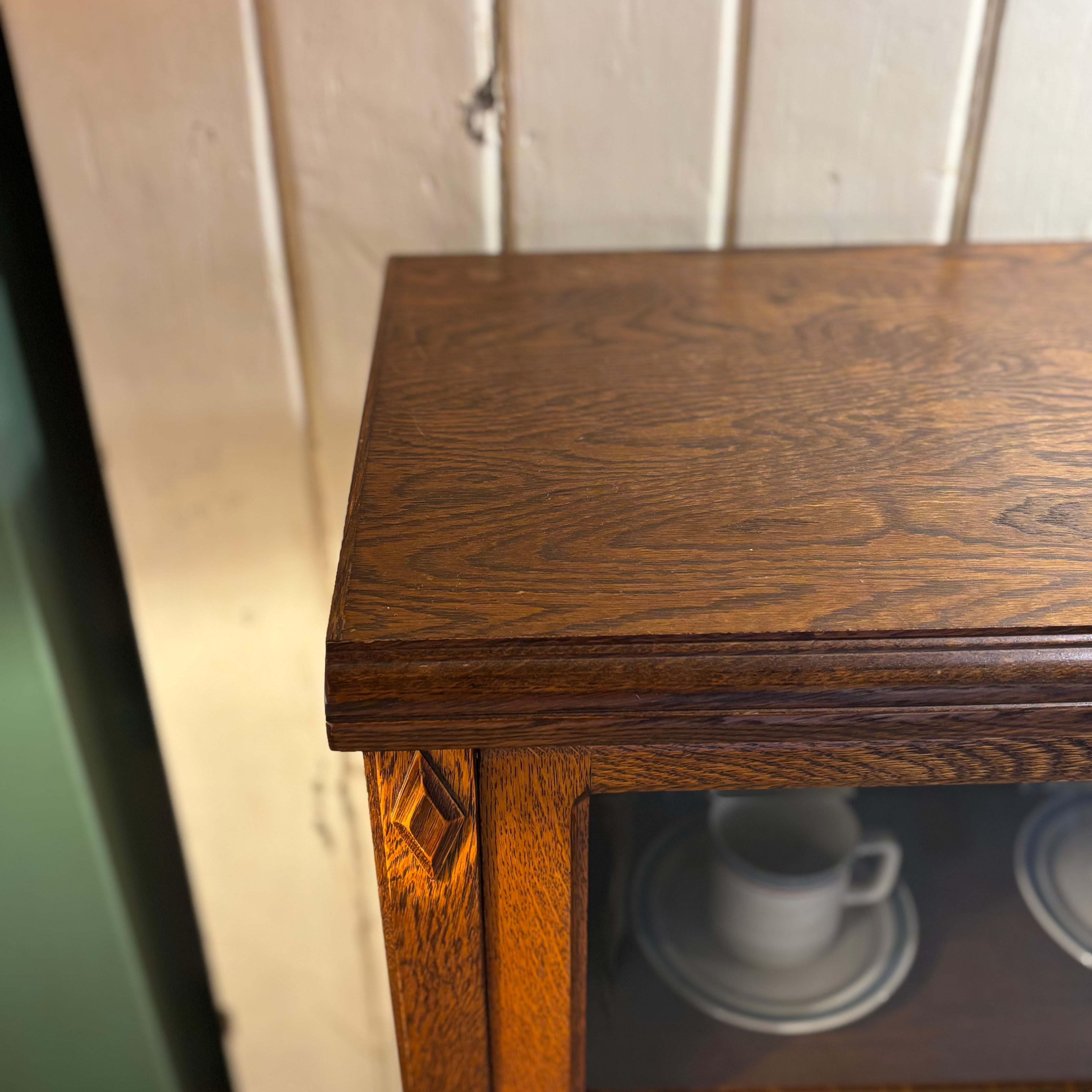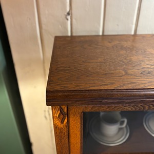 .ガラス越しに見せる収納が楽しめるキャビネット。 木目の表情がしっかり出たオーク材に、 フラップ式のガラス扉。 お気に入りの本や器、オブジェを飾って楽しんでください。 Size:W850 D330 H1180mm 新品ではございませんので、多少のコキズや使用感はご了承くださいませ。 *中古品のため写真に撮りきれない小傷等ご理解ください。神経質な方、完璧を求める方はご遠慮ください。