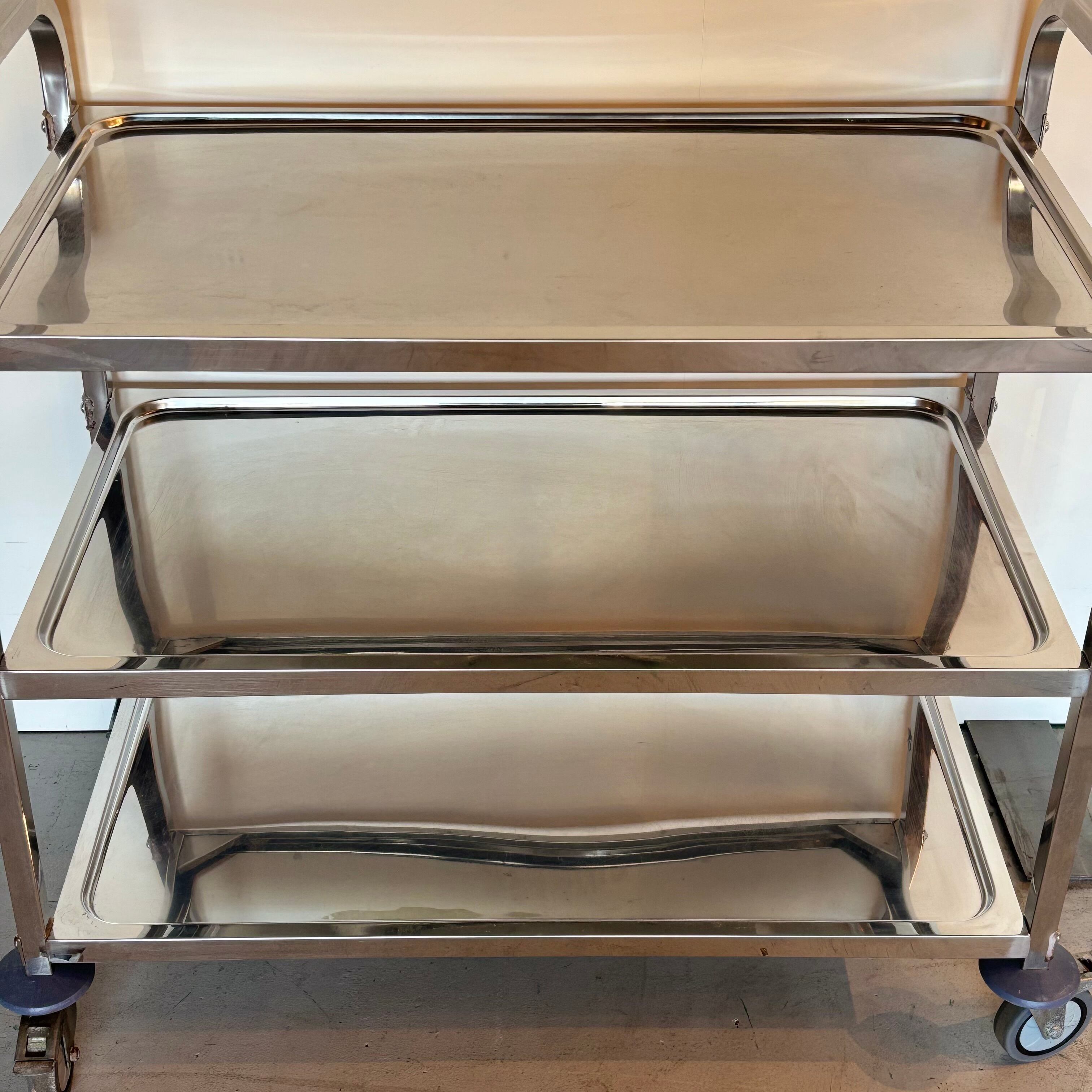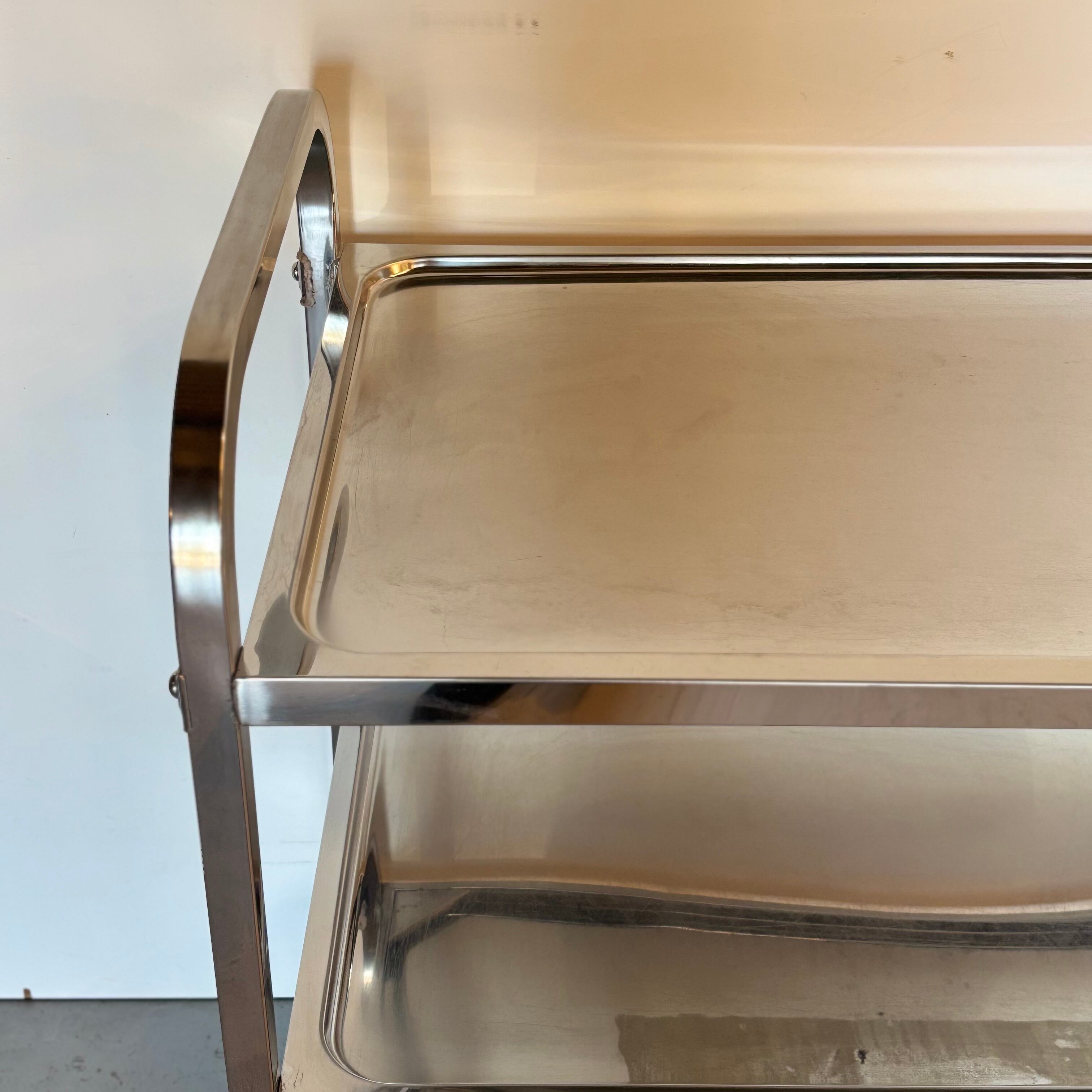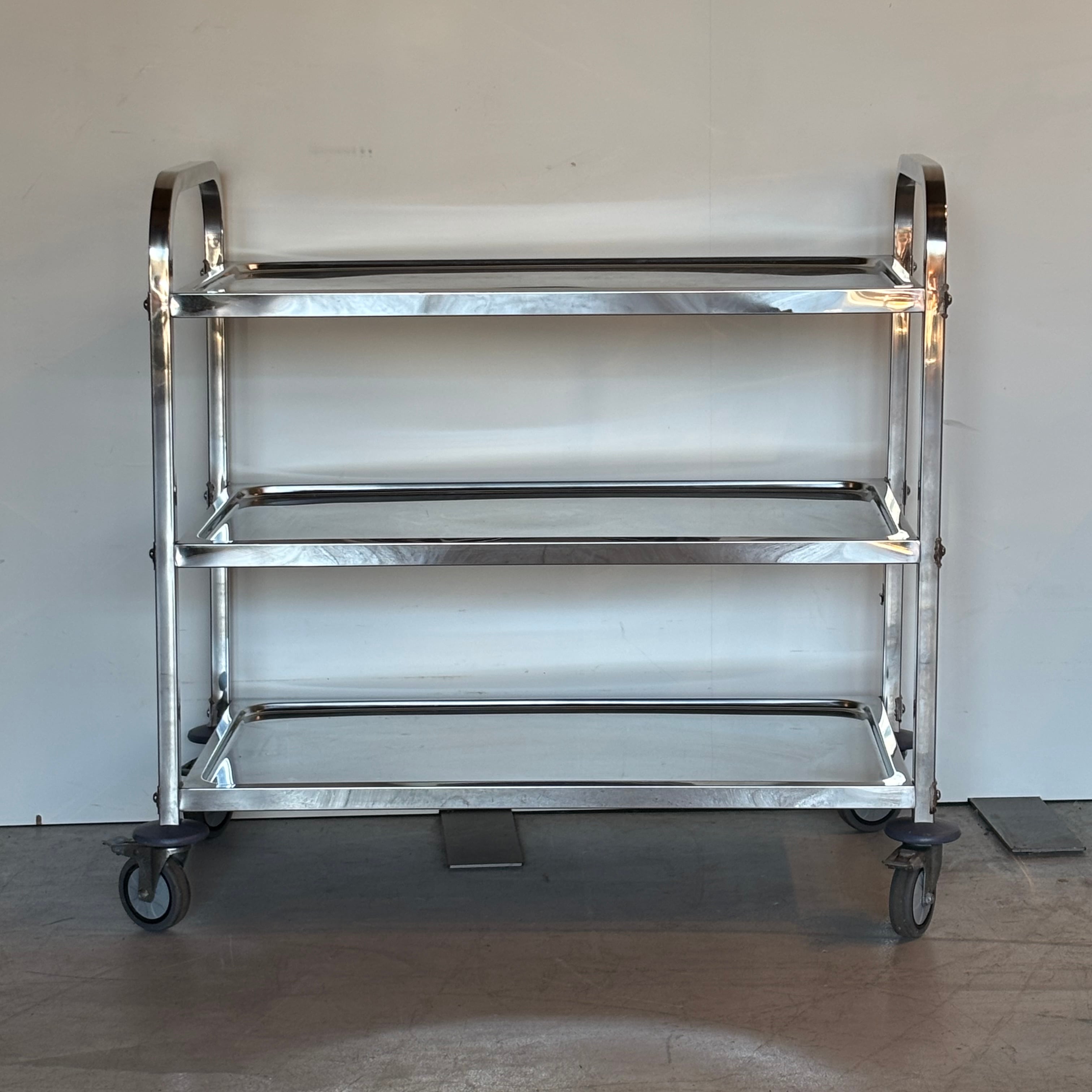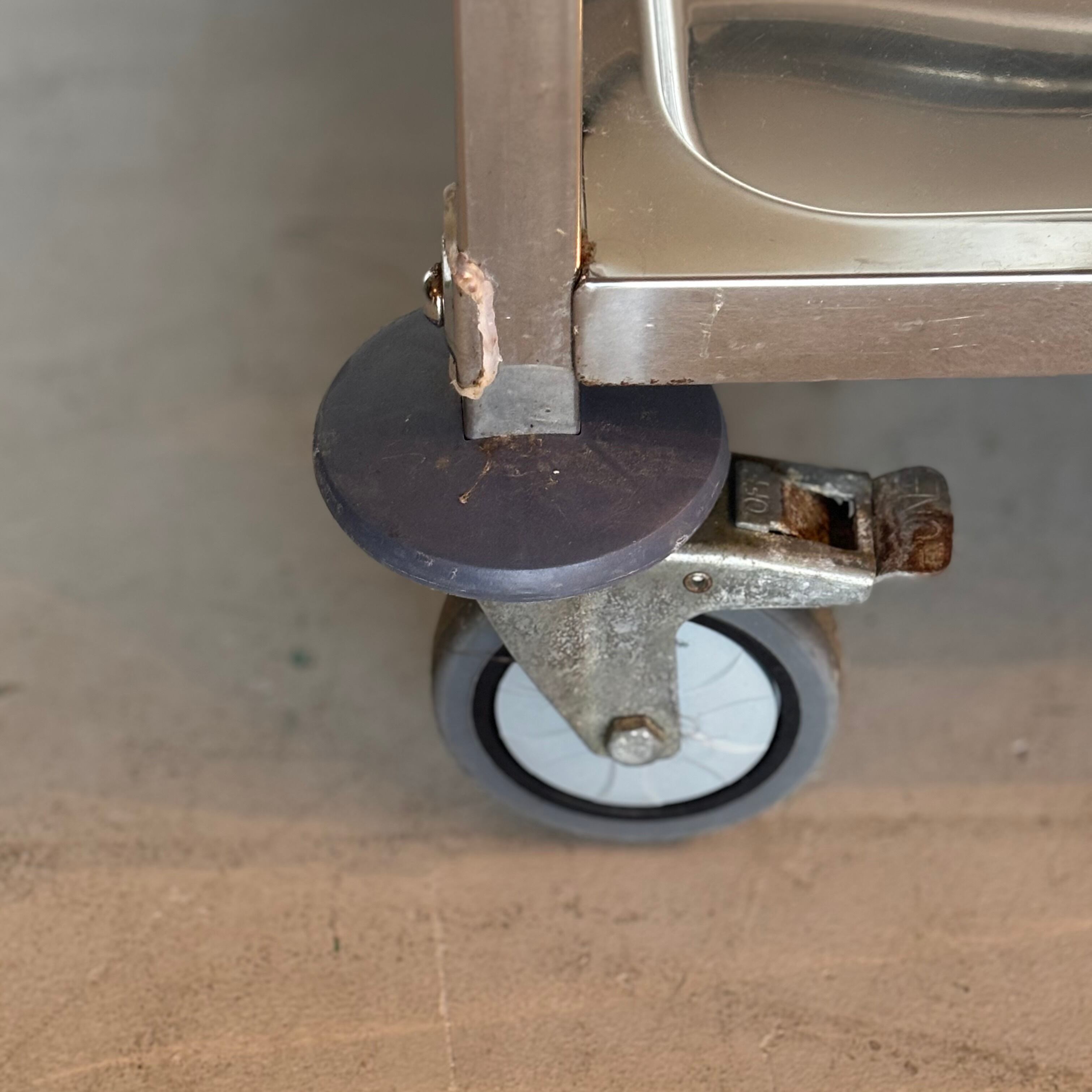 . ステンレスのワゴン。 よく入荷する物よりちょっと大きめ。 キッチンワゴンとしても良し、ターンテーブルを置いてDJテーブルがわりにしても良いかも。 ストッパー付きなので安全です。 動作スムーズですよ。 Size:W950 D500 H930mm 新品ではございませんので、多少のコキズや使用感はご了承くださいませ。 *中古品のため写真に撮りきれない小傷等ご理解ください。神経質な方、完璧を求める方はご遠慮ください。