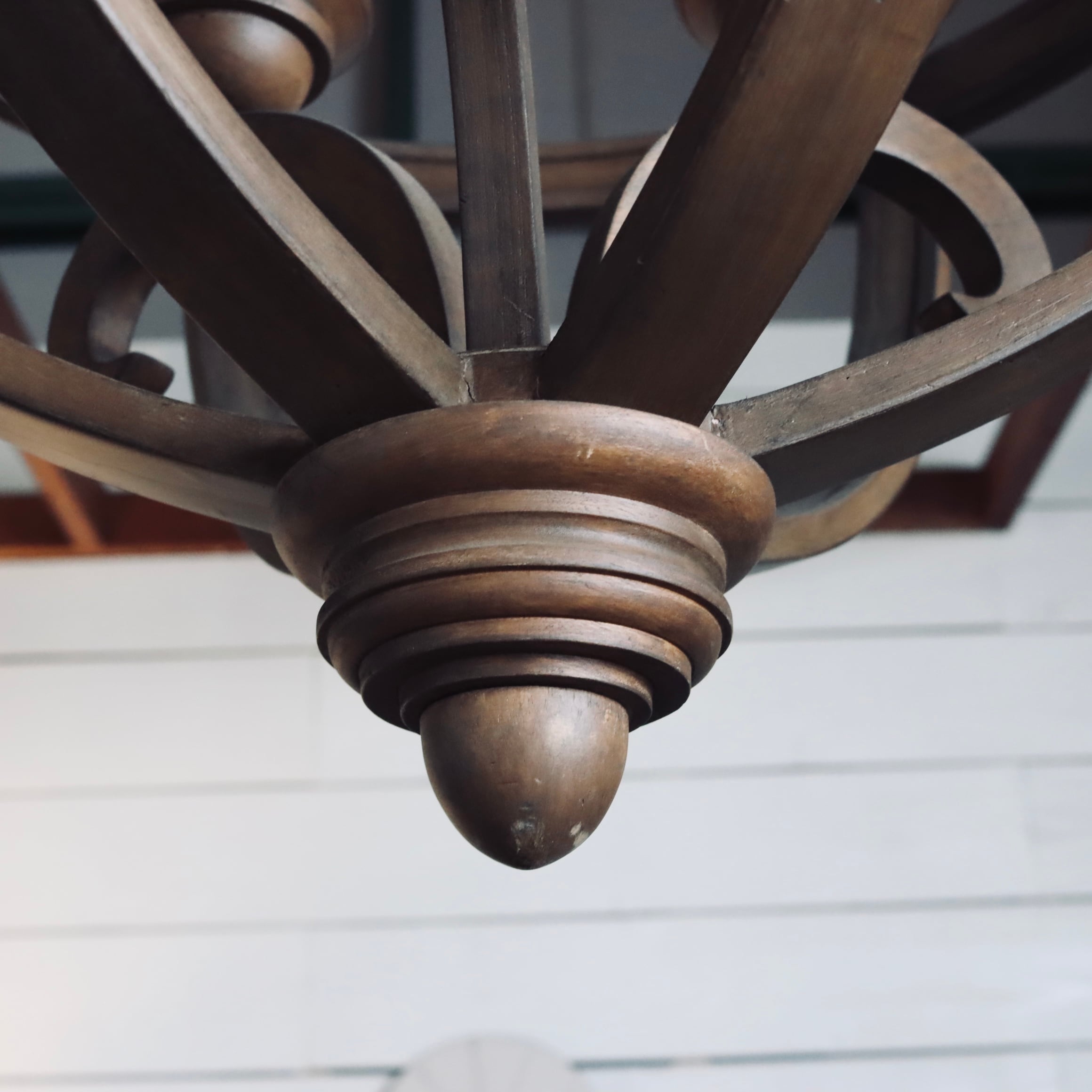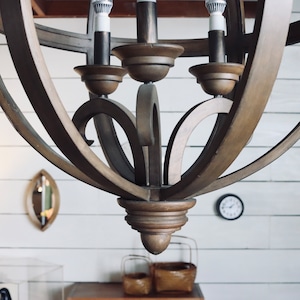 細いウッドフレームに包まれた球状のシャンデリア。